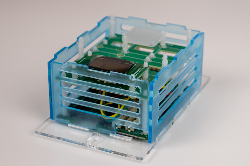 Als Letztes vom Gehäusedeckel auf beiden Seiten die Schutzfolie entfernen und ihn so anbringen, dass die Abstandshalter und die Seitenteile einrasten: