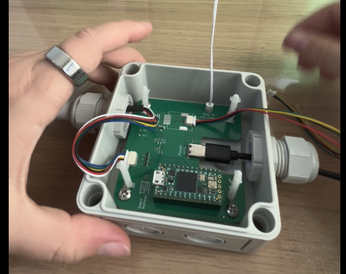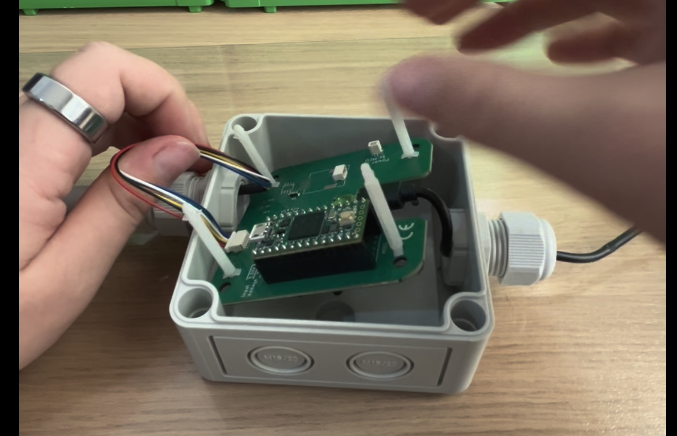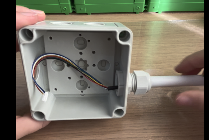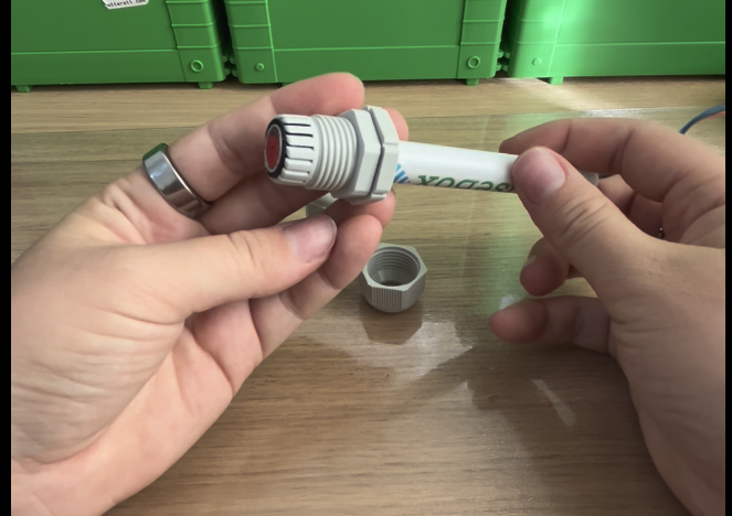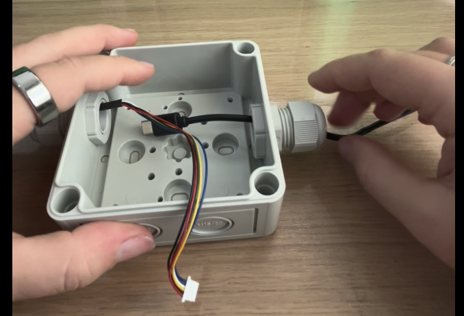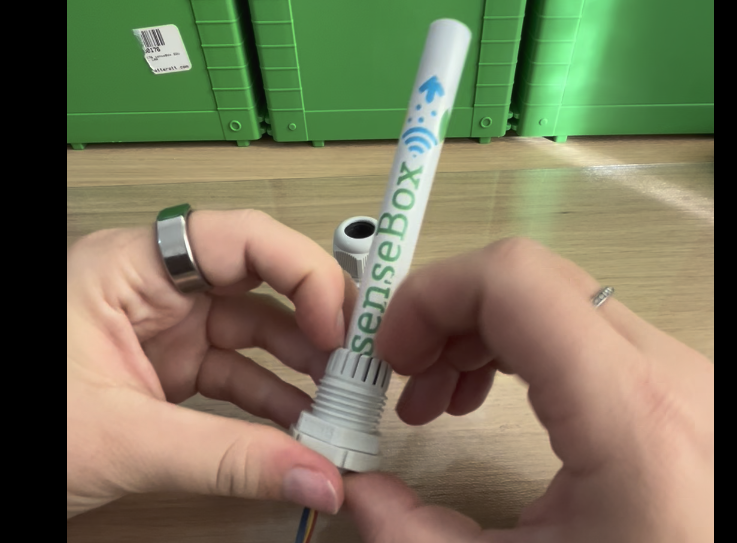 Bevor du die senseBox einsetzt, überprüfe, wie weit das Mikrofon aus dem Gehäuse herausragen soll. Jetzt ist auch der richtige Zeitpunkt, die Kabelverschraubung auf der USB-Seite fest anzuziehen, damit das Gehäuse möglichst dicht bleibt und keine Feuchtigkeit eindringen kann.