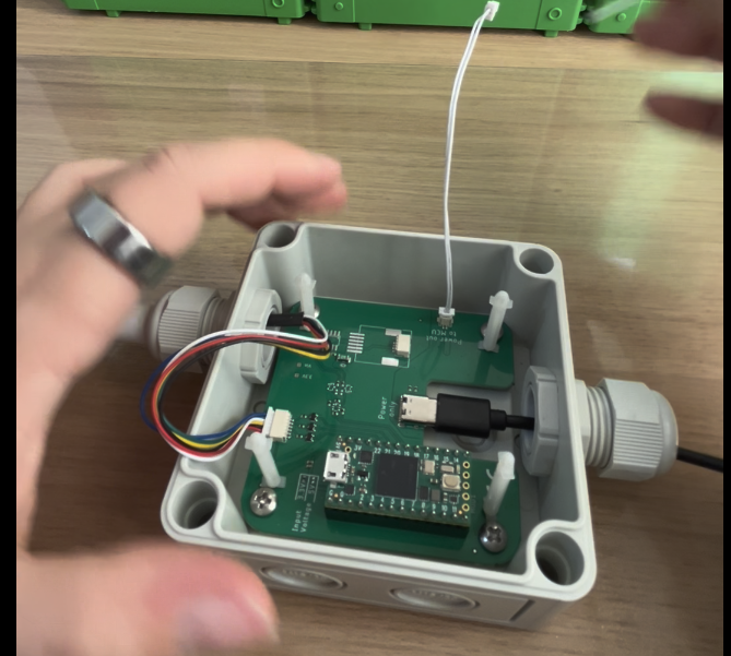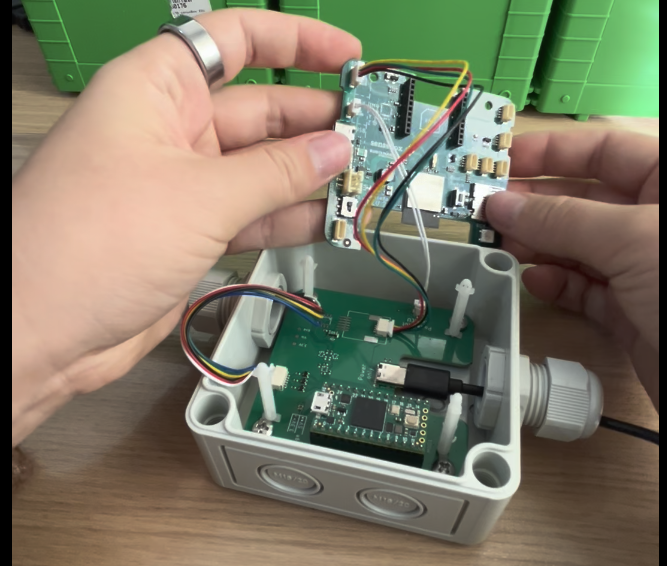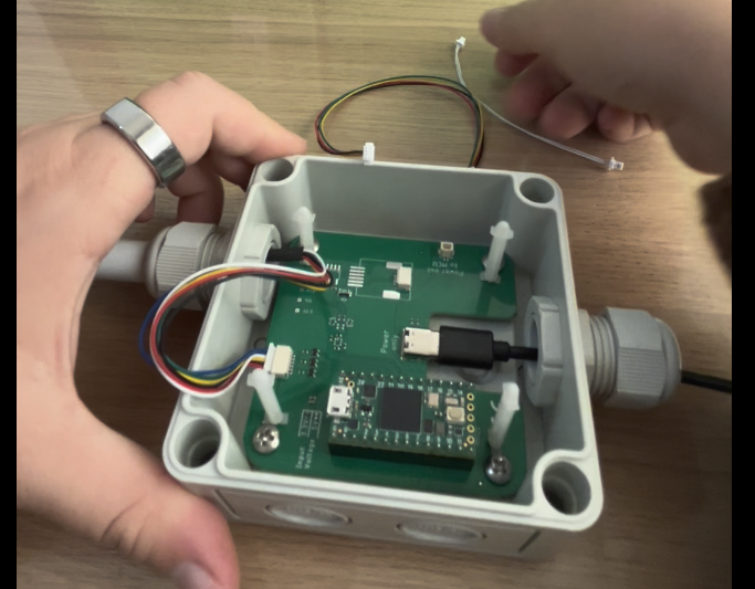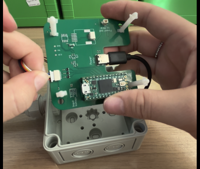 Verbinde nun die senseBox MCU-S2 mit den Kabeln. Nutze dazu die QWIIC- und Stromanschlüsse oberhalb des USB-C-Ports.