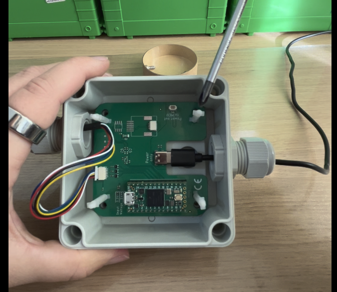 Bevor du die senseBox auf die Abstandshalter drückst, lege den Silikagel-Beutel auf der Platine. Er hilft, Feuchtigkeit im Gehäuseinneren zu reduzieren.
