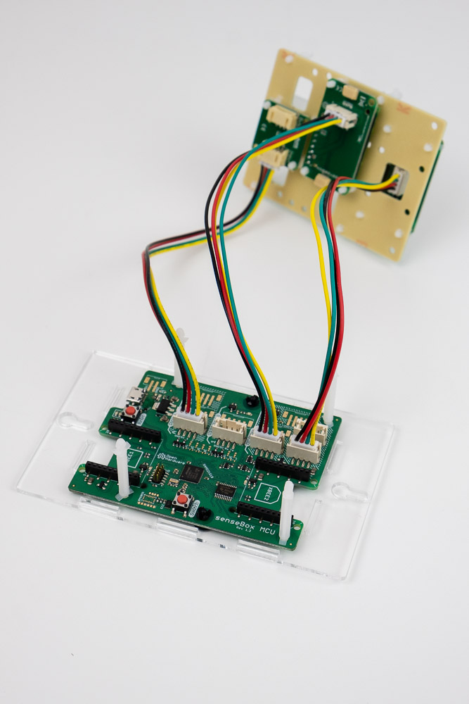 Now you can connect the sensor holder to the MCU using the long spacers. Make sure that the holder is not attached the wrong way around and is exactly parallel to the MCU: