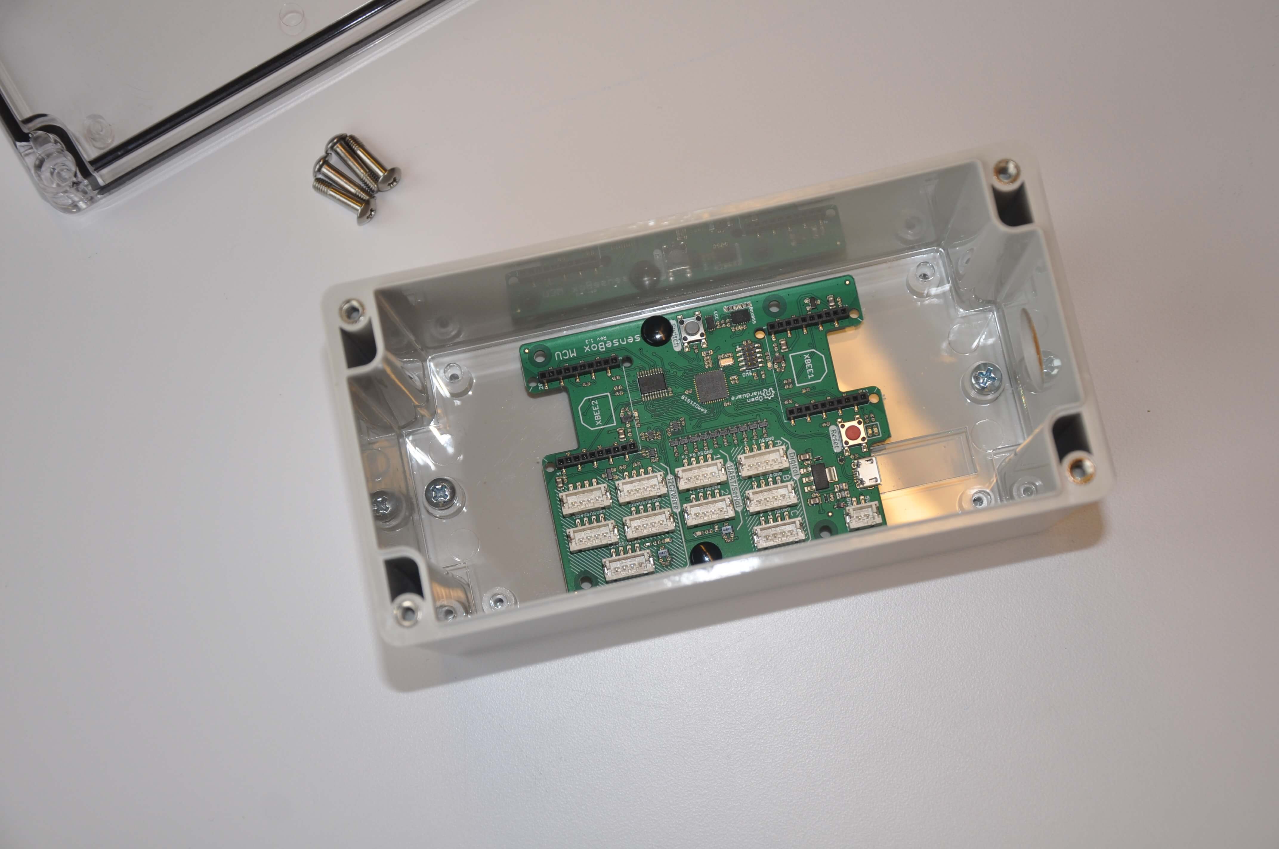 Now screw the acrylic plate into the case. Make sure that the opening for the USB port aligns with the opening of the case. After that, you can use the black screws to attach the senseBox MCU to the acrylic plate. Again, ensure that the USB port is aligned with the opening of the case.
